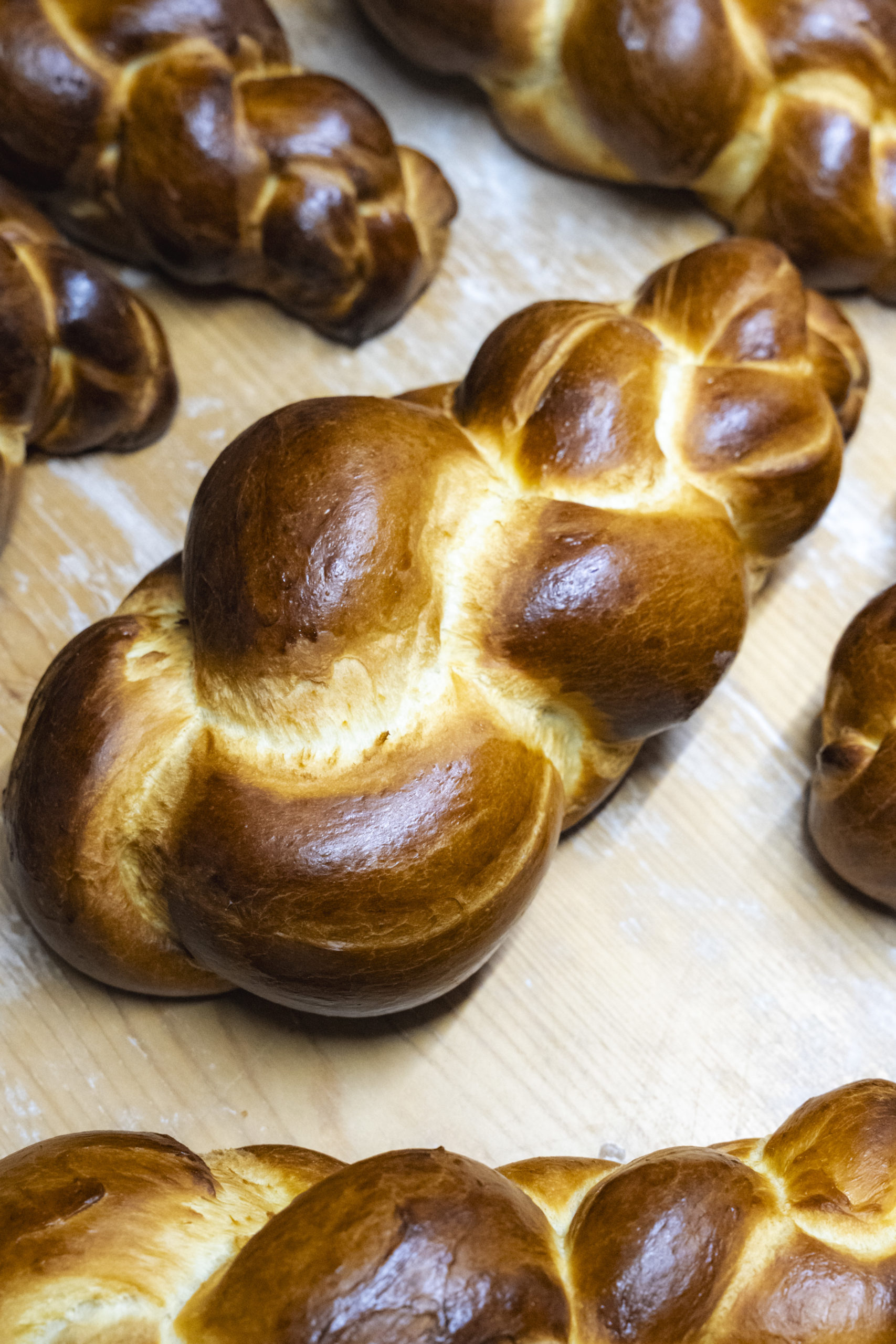 Am Samstag geht es früh los auf dem Betrieb. Rudi steht auf, um den alten restaurierten über 100 Jahre alten Holzofen anzufeuern. Drinnen im Ofen werden die Züpfen langsam gebacken. Es riecht immer hervorragend, wenn die ersten Brote den Ofen verlassen. Nach dem Einkaufen darf eine gemütliche Kaffeerunde beim Holzofen nicht fehlen.