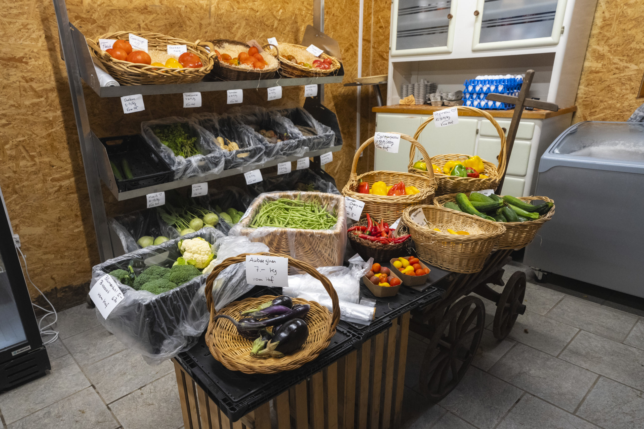 Unser Hofladen, ein Ort, an dem all unsere Produkte in die Gesellschaft finden. Neben dem Gemüse bieten wir Teigwaren, Polenta, Mehl, Eingemachtes, Getrocknetes, Gefrorenes und Fermentiertes an. Wir tüfteln immer wieder an Neuheiten. Um ein grosses Sortiment anbieten zu können, haben wir einen Teil der Früchte und Gemüse zugekauft. Auch andere Produkte von Höfen in der Umgebung haben ihren Weg in den Laden gefunden: Honig von unserem Nachbarn Heinz Ryser, Eier von den Stotzers und eine Vielfalt von Getreide und Hülsenfrüchten von Mülheim Hans aus Schwadernau, der sogar den Mut hatte, sich das Wissen anzueignen, um Reis anzubauen.